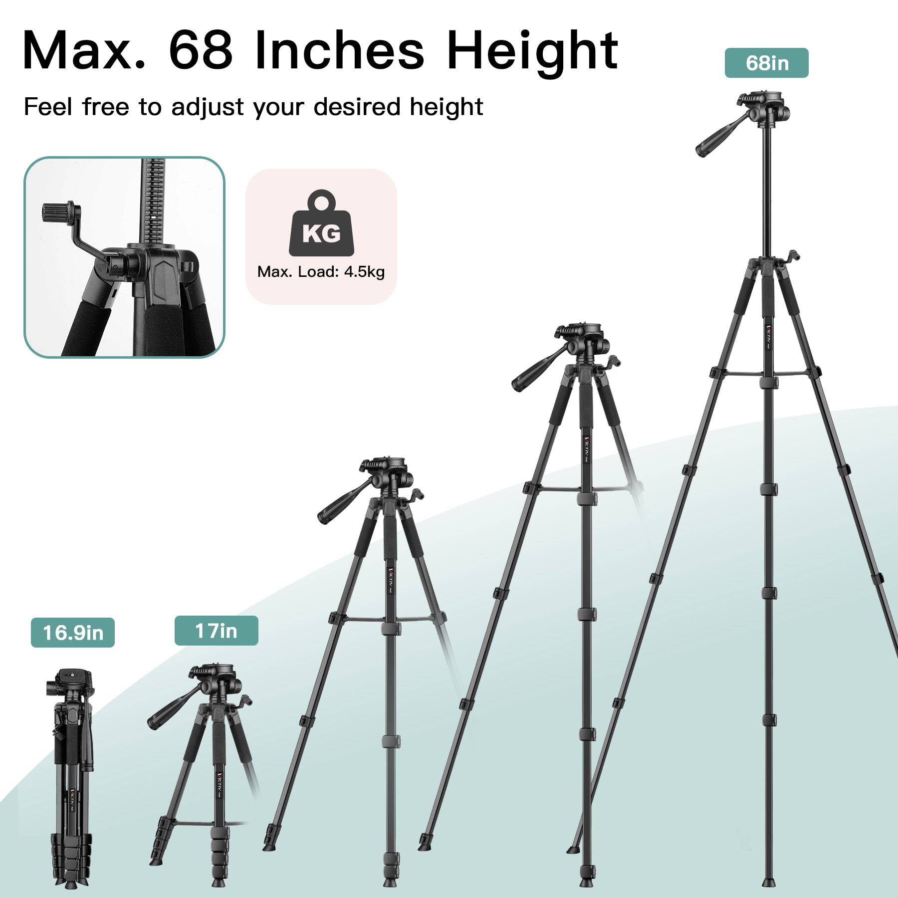 | 【 Camera Tripod for Phone and Tablet】Victiv P50R camera tripod comes with a 2-in-1 Phone & Tablet Holder, it can easily accommodate both your tablet and phone, providing convenience for various usage scenarios. Whether you want to use your tablet for watching videos or your phone for taking quick photos, it has you covered. Additionally, ipad tripod is equipped with wireless remote, allowing for more flexible operation and control【Enhanced Compatibility】The camera tripod stand features aluminum leg tubes and anti-slip rubber feet. , delivering exceptional stability. The center column features hooks for hanging bags, further enhancing stability. Stable camera stand tripod with a 1/4" quick release plate can directly mount DSLR Cameras, Mirrorless Camera, Digital Cameras, also Action Cameras, mini projectors.【68" Adjustable Phone Tripod Stand】Tripod for iphone features a unique rocker design. With quick-release plate buckles on the legs, the height can be adjusted from 16.9 inches to 68 inches. You can easily adjust the height according to the scene and your creative ideas, providing greater flexibility and convenience in your photography or videography work【Tripod for Tablet with 3-Way Pan Head】Tablet tripod's pan head allows for 360-degree horizontal rotation, enabling you to capture panoramic views with ease. Tripod for iPad also supports both upward and downward tilting, making it suitable for various shooting angles.【Lightweight and Portable Tripod】The phone tripod weighs only 1.68lbs, and the storage size only 16.9 inches. It's perfect for travel and outdoor photography.【Complete Tripod Units】The tripod kits include P50R tripod stand, a universal holder (2.4"-7.9"), a wireless remote, and a carrying bag. With this complete set, you have everything you need to start using the tripod right away, whether you're on a trip, at an event, or in your own studio |