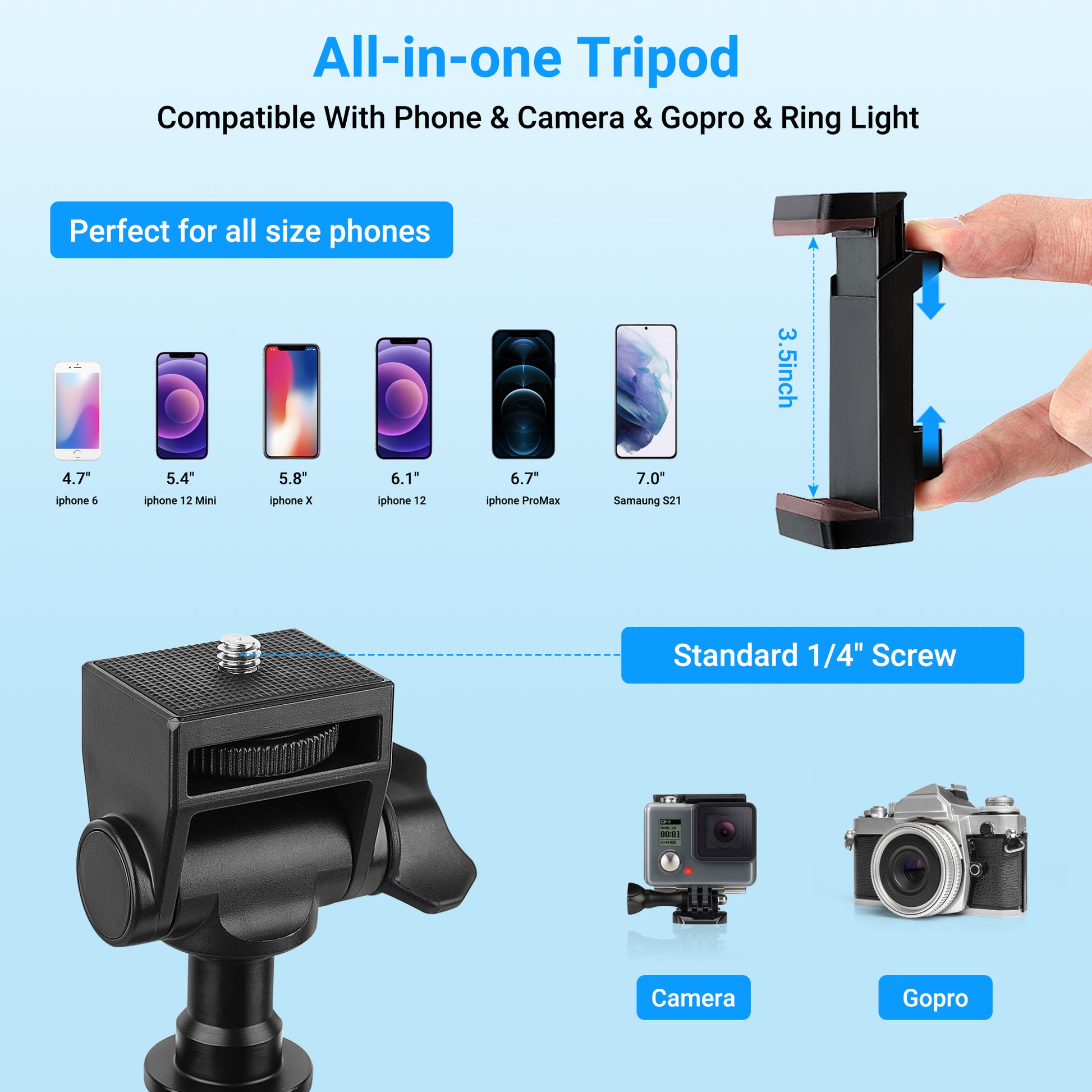【Widely Compatible】The Cell Phone Tripod With Universal 1/4 Inch Screw, Compatible With All Phones, Such as iphone 13 Pro Max / 13 Pro/12 Pro Max/12 Pro/Camera/Ring Light.