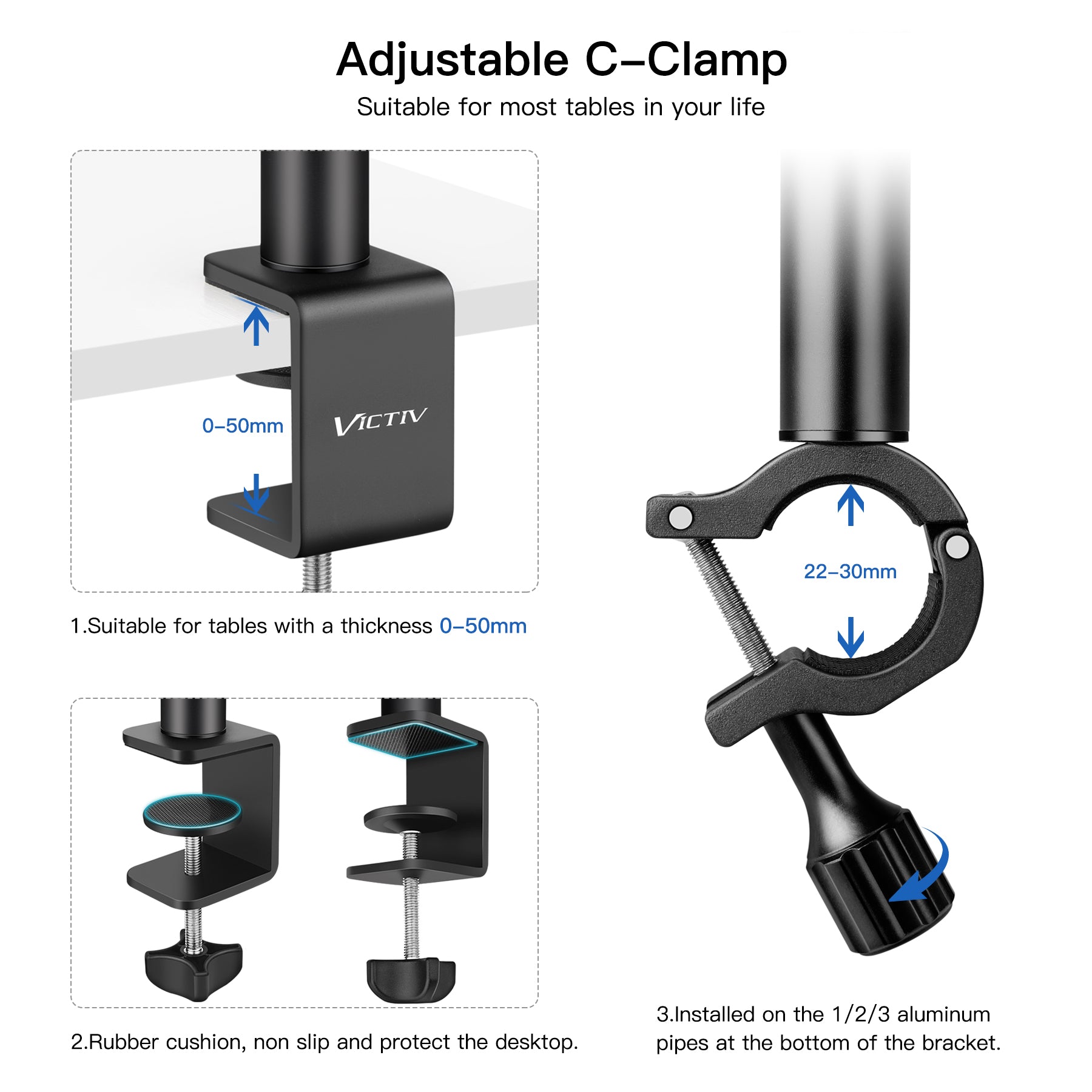 【C-stand Table Clamp】Aluminium C-stand table clamp with soft padding on both sides provide better stability and protect the tabletop, can be fixed on desks, dressers, dining tables, bedside tables, etc., suitable for table tops up to 5 cm/1.96" in thickness, space-saving and durable
