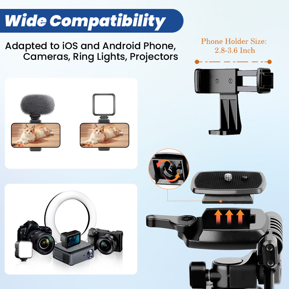 【Tripod Stand with Cold Shoe Phone Clip】We provide a rotatable phone holder which is compatible with all cellphone between 2.2'' to 3.74'' (5.58-9.49cm). It can be rotated with 360 degree and also be disassembled into a simple phone holder to use. When you are live streaming, you can attach a light or microphone to the cold shoe mount on this phone holder.