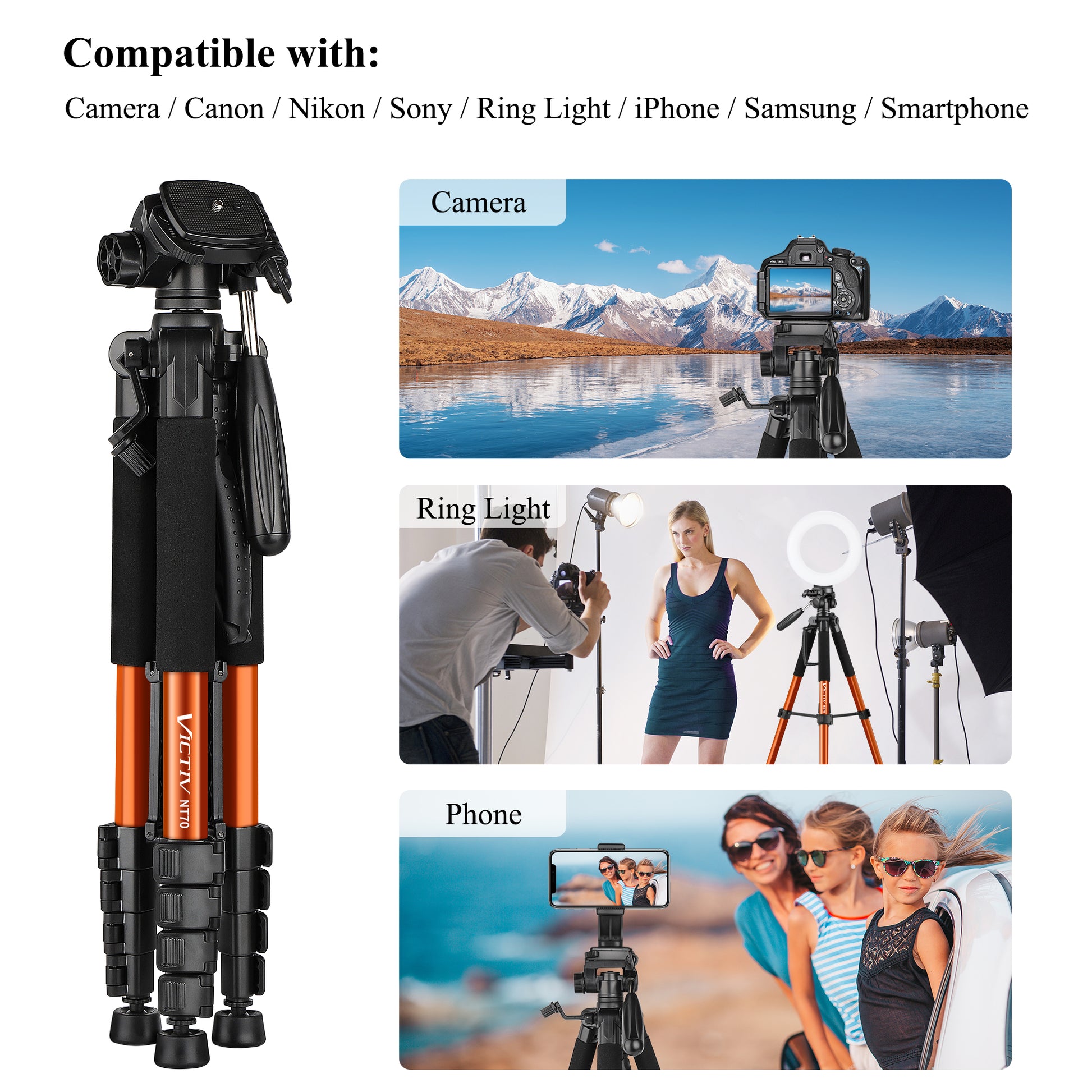 VICTIV 74” Camera Tripod for Canon Nikon Sony, Lightweight Travel Tripod with Carry Bag, Aluminum Professional Camera Tripod Stand for DSLR/SLR (6.35kg/14lb Load)