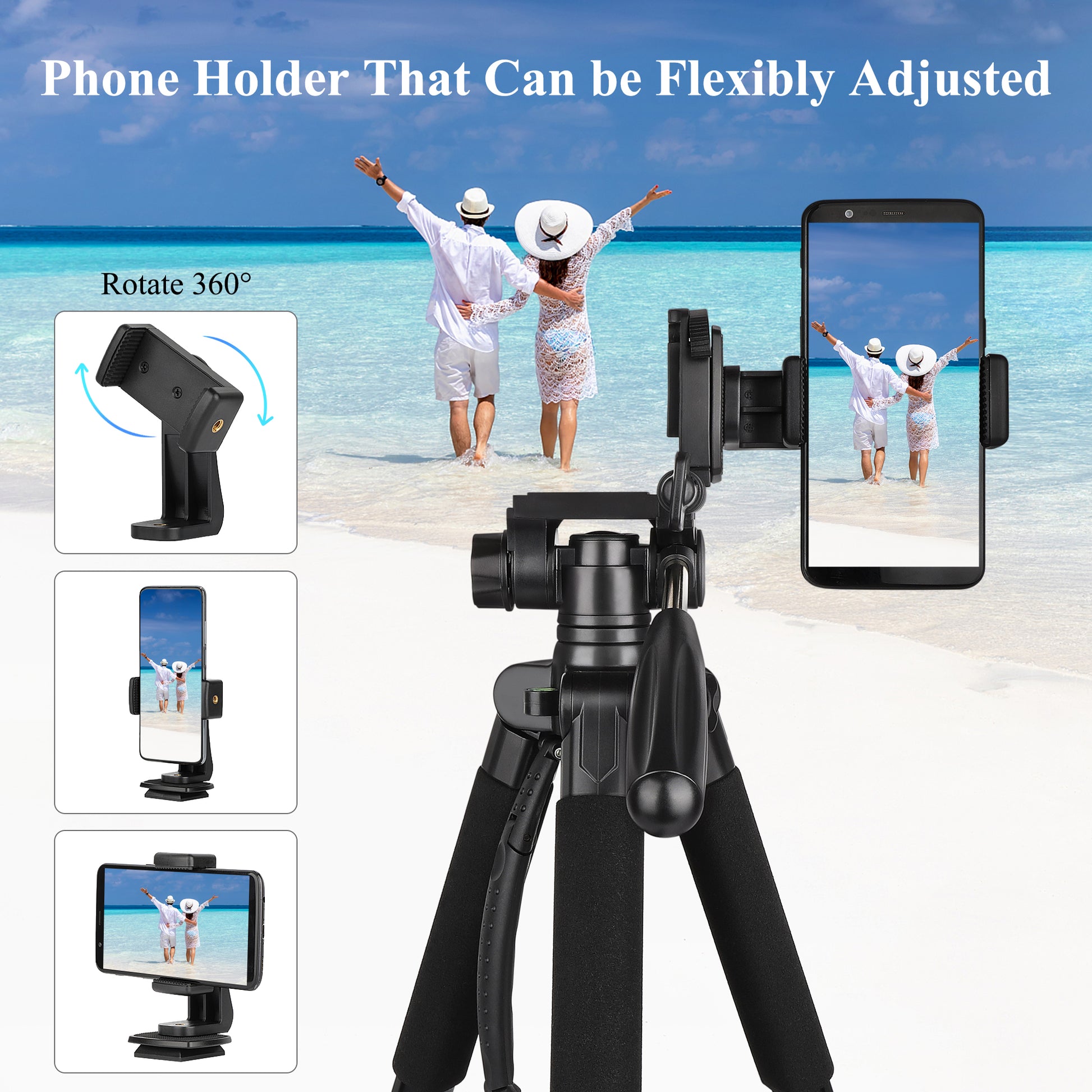 【High Compatibility】The camera tripod with 1/4” quick release plate, compatible with all cameras. Suitable for photography, video recording, live broadcasting, selfies, etc. The phone holder that can adjust the angle freely(landscape mode & portrait mode), compatible with all phones.