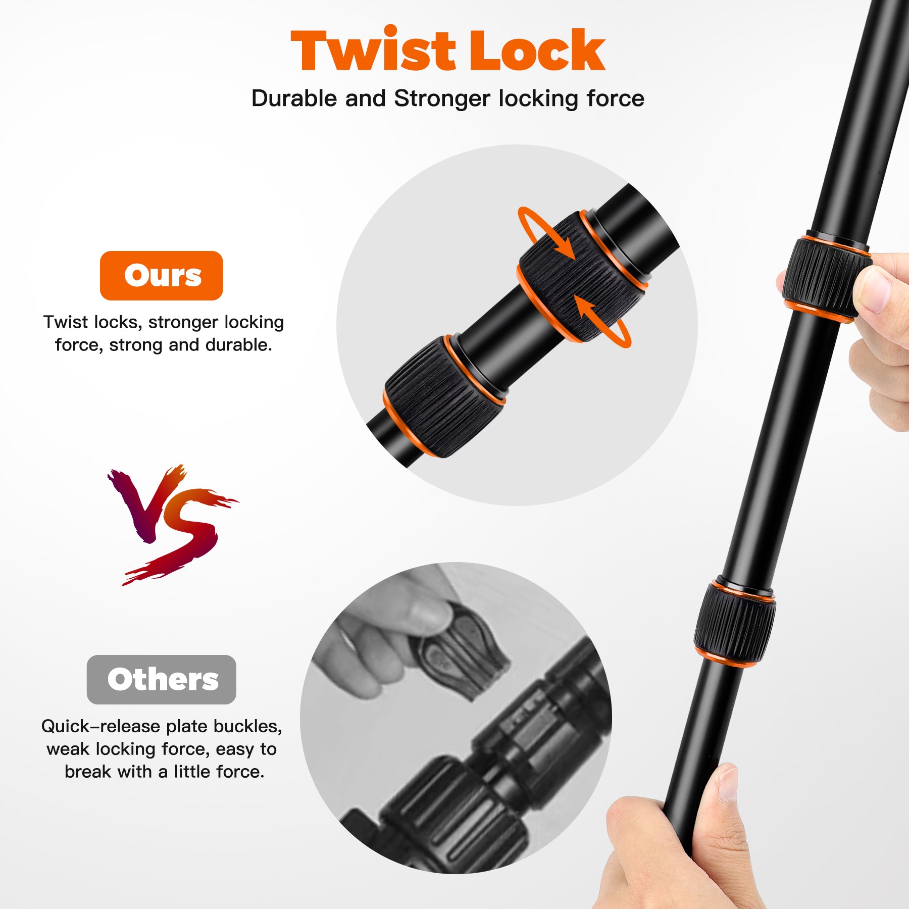 | 【Heavy Duty Camera Tripod with Twist Locks】 Heavy Duty tripod with multiple adjustable features, including telescopic legs, flexible ball head and angle adjustment plate buckle. You can adjust the height, angle and direction as needed. Twist Lock Tripod is made of high-strength aluminum alloy with excellent compression resistance and durability. It can withstand the weight of heavy cameras and lenses, stably supporting the equipment and ensuring that it won't shake or tilt during shooting【Panoramic Ball Head Tripod-36MM】Ball head tripod with sturdy ball head allows 360-degree panoramic shots, elevation shot and top-down shot. U-shaped grooves offer the possibility of vertical shooting. Note: The large knob controls the rotation of the sphere and the small knob controls the horizontal rotation of the head.【Macro & Lowr Angle Photography】 Camera Stand Tripod can be folded in reverse, easy to realize Macro Photography. You can adjust the length of the tripod legs according to the shooting needs, so as to adjust the shooting height from the ground, providing the right distance and angle for shooting different subjects. Replace the tripod center column with a short 4-inch tube, and adjust the leg tube angle to the maximum for low angle shots.【Professional Camera Monopod Tripod】 The Versatile Camera Tripod Stand features a removable center column and a detachable tripod leg. With a simple combination, they can be converted into a height-adjustable monopod (31"-81"). You can use the lightweight monopod as an alpenstock while hiking or walking.【Camera Tripod with Phone Holder】 Camera tripod stand with phone holder ( Rotatable 360°) can carry most cell phones: iPhone 15 14 13 12 11/11 Pro/XS Max/XS/XR/X/8/8 plus/ Galaxy Note 9/S10/S20. 1/4" screw tripod can carry DSLRs, compact video cameras, full-frame cameras, binoculars/Spotting Scope, cameras with lenses and digital cinema cameras, projectors, and laser levels. An additional quick release plate accessory can carry another device, offering the possibility of fast device switching. |