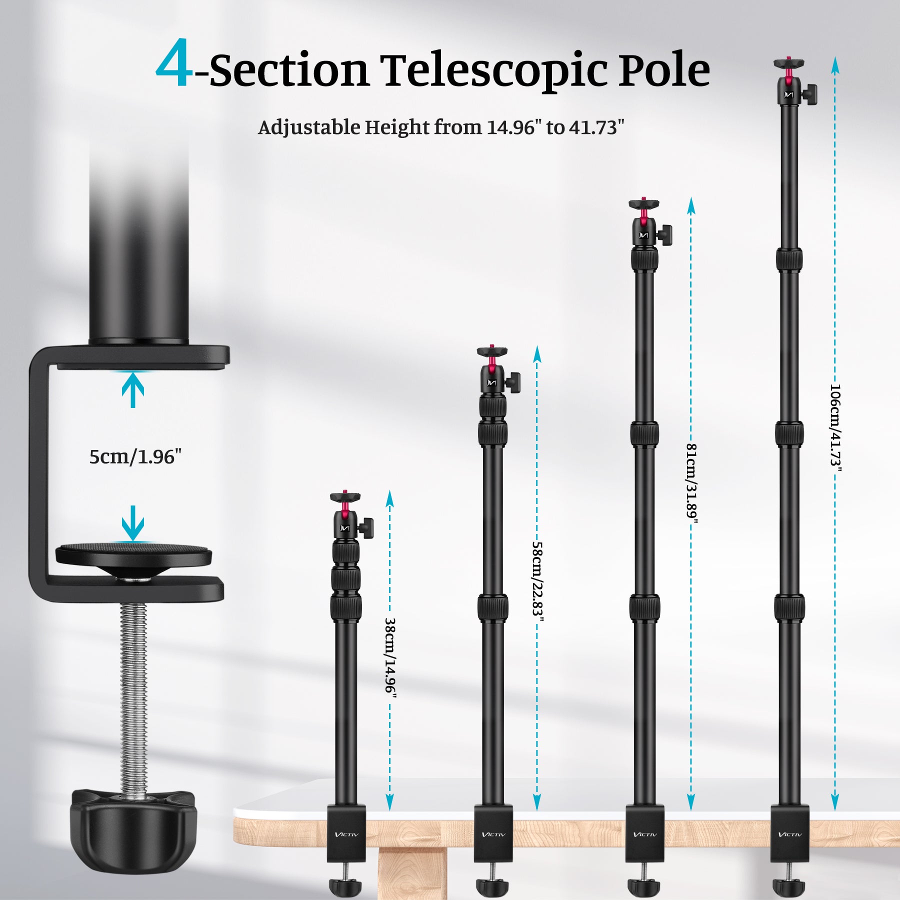VICTIV Camera Desk Mount Table Stand with Ball Head, 15"-41" Adjustable Desktop Light Stand, Tabletop C Clamp with Phone Clamp for DSLR Camera, Ring Light, Live Streaming, Photo Video Shooting