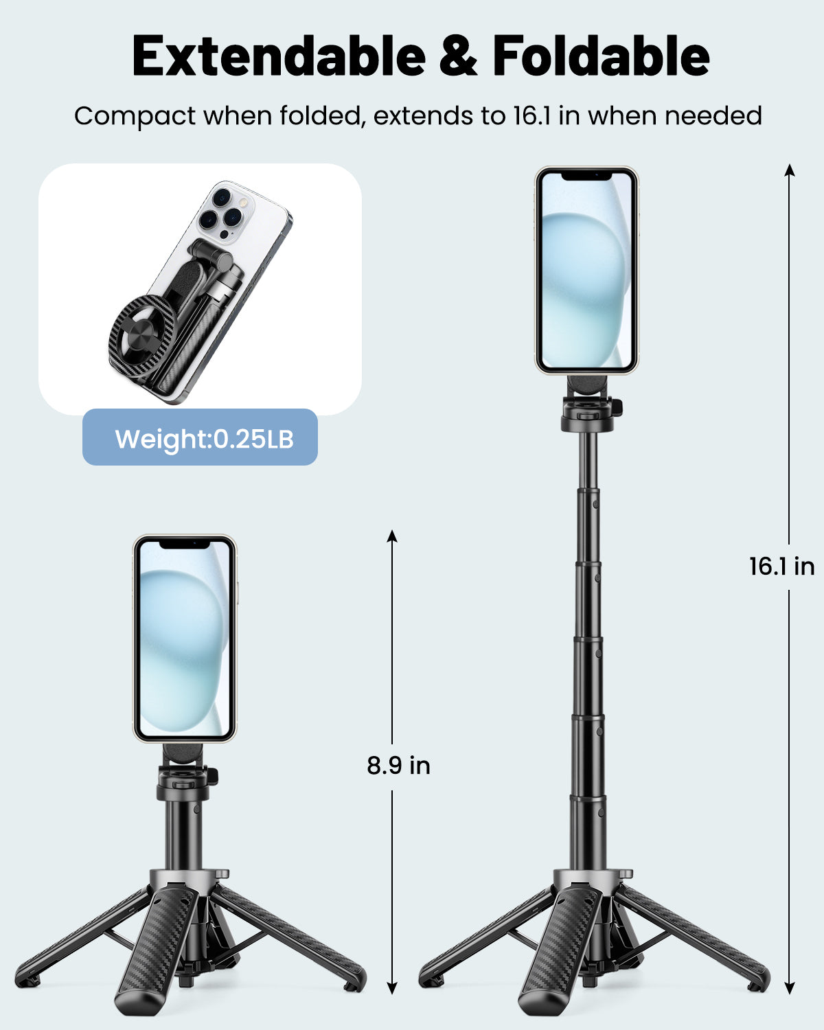 | đ§˛ăHigh-Compatibility Magsafe TripodăWhen the phone is brought close to the magnetic part of the stand, it can be attached in just 1 second. Adopting N52 super-strong magnets, it can firmly fix the phone even in extreme sports scenarios. It is compatible with iPhone 17/16/15/14/13/12 series and MagSafe cases. For other smartphones, the included magnetic metal ring ensures a secure fit! |